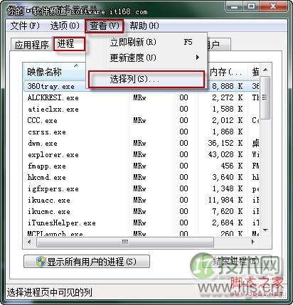 首先进入“进程管理器”找到“进程”功能选项,然后在进程功能选项下的工具栏上选择“查看—选择列”。