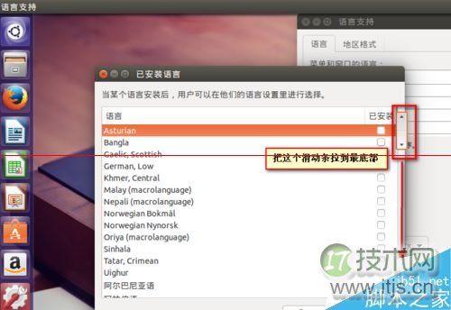 7、我们把在语言支持列表(第一个是English)中的汉语,拉到English上面去,意思是第一个系统语言。然后点击该界面下面的第一个按钮。如下图