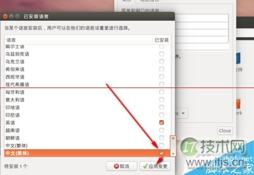 5、香港云服务器勾选语言列表中的“中文简体”或叫“chinese(simplified)”,然后点击左下角的那个按钮,假如你的此界面和我一样,那么就是点击的"应用变更"按钮。假如是英文的,勾选然后点击那个位置的按钮即可。