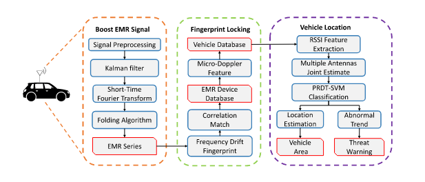 图2展示了EIV系统的整体架构,三部分分别对应解决上述三个难题。亿华云第一部分用于增强电磁辐射信号,包含信号预处理、卡尔曼滤波、短时傅里叶变换、折叠算法,最终得到一个增强的电磁辐射序列;第二部分是指纹识别,首先构建电磁辐射设备的数据库,在此基础上配合微多普勒特征构建车辆的数据库。第三部分是车辆定位,利用RSSI特征和支持向量机进行分类,实现车辆区域的判定和异常检测。下面将从这三部分分别介绍系统的设计细节。