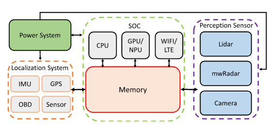 图3所展示的是现代车辆的智能驾驶系统。感知模块和定位模块在获取信息后需要先传输至SOC的内存中,而后CPU、GPU/NPU会从内存模块中获取数据并进行运算并做出决策。由于智能车辆需要实时通过雷达等设备获取外界感知信息,故各模块与内存模块的数据传输量极大,使得内存模块总是云服务器处于高负载状态。车辆的内存模块主要采用DRAM,DRAM具有低成本、低能耗、大容量和高效率的特点。经过调查发现,大部分车辆都是用先进的SOC,并且内置DDR内存。