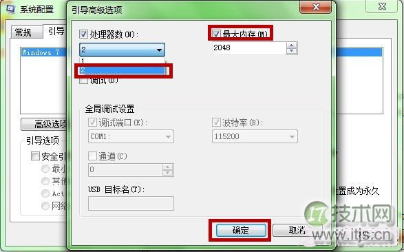 第三步、再“处理器数”和“最大内存”,我们都把他们调整为电脑的最大值,点“确定”退出。