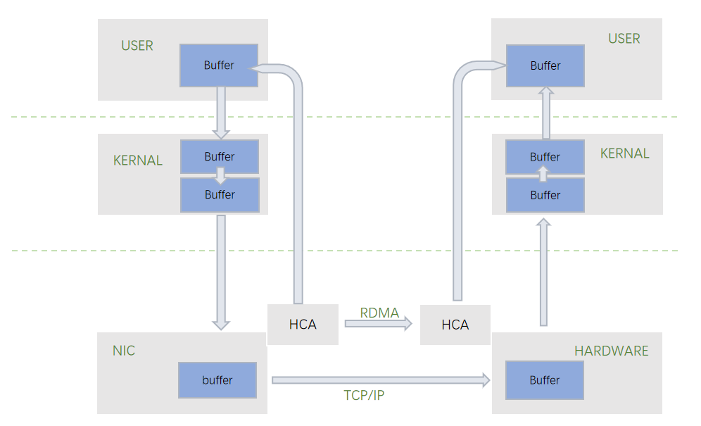 RDMARDMA 是一种远程直接内存访问的技术。在传统的 TCP/IP 协议中,数据传输时会经过多次的数据拷贝,以及经过 CPU 的内核上下文切换。数据需要经历从用户态到内核态,从内核态再拷贝到网卡。同时,TPC/IP 协议会有一些处理开销,包括 Buffer 管理,协议栈管理,以及发送完之后系统中断引起的开销。RDMA 技术能够帮助计算机直接存取另外一个计算机的内存。