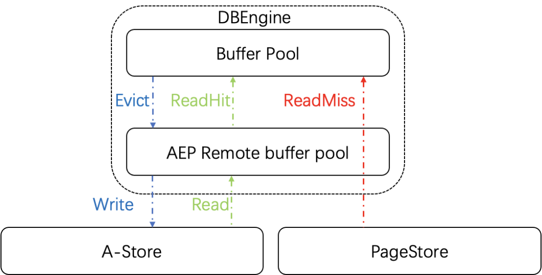 原生的 mysql 处理查询都是单线程的处理模型,访问数据时都要先去判断数据是否在 Buffer Pool 中,如果不在,我们需要通过同步的接口把数据从远端存储拉到 Buffer Pool。如果数据没有命中 Buffer Pool,比如数据量很大,Buffer Pool 线上最多开 100 G ,对于用户的请求,请求延时就会增加。为了缓解拉取远端存储的性能下降问题,我们扩展了原生的 Buffer Pool 设计,将 A-Store 作为一个远程分布式的二级缓存,来扩大缓存空间的大小。它的一个主要优势是:延时更低,容量更大。