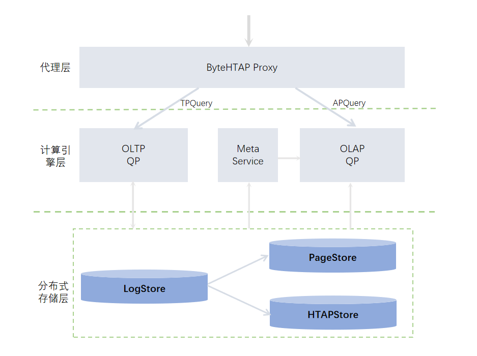 打破 AP(Analytical Processing) 和 TP(Transaction Processing)系统中间的墙:在数据库发展最初阶段,其实存在只有一个系统,不用区分 TP 和 AP 。伴随着数据量的增长,单个系统内部没法既支持 TP 又支持 AP, 因此发展出两个方向 OLTP 和 OLAP 。HTAP 的出现能够打破 TP 到 AP 之间的墙,在一个系统中同时去支持这两类负载。实时性:伴随着互联网的发展,互联网企业的数据呈现爆发式增长。TP 和 AP 的用户 pattern 是完全不同的——TP 的 pattern 一般是命中二级索引的简单类查询,再加上一个增、删、改的高频更新操作,但是 AP 系统处理的都是一些复杂的查询。这两种 Workload 本身是非常不同的,所以如果在一个系统里,数据量比较大的前提下去支持这两类负载,基本不太现实。目前许多公司都有两套系统, TP 和 AP 系统,而这样的架构会带来三个问题:一是,实时性要求。数据产生在 OLTP 系统里,然后经过 ETL 的清洗流入到数据仓库之后,数据通常会存在分钟级甚至小时级、天级的延时。二是,数据一致性的要求。当前许多用户的使用场景都是把数据从 TP 的系统导入到 AP 的系统,在多个系统之间维护一致性非常困难;三是,成本,包括人力/硬件成本。以上是业界提出 HTAP 的背景,在字节跳动,我们希望进行横向融合探索,通过对外提供 everything is SQL 的接口;在内部,不管是 TP 还是 AP,PG 还是 MySQL,通过设置统一的处理层来简化业务应用数据管理体系。
