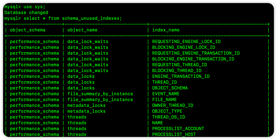 在 MySQL 的元数据库 sys 中有一个名为 schema_unused_indexes 的视图,该视图中就保存了各种创建了但是未使用的索引: