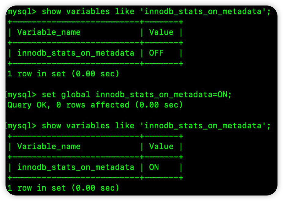 首次打开表。表大小发生变化。执行 SHOW TABLE STATUS执行 SHOW INDEXMySQL 客户端开启自动补全功能打开 infomation_schema 库中一些相关的表这些行为都会触发统计信息的自动更新,如果表中数据量比较大,担心以上行为降低表的性能,那么也可以修改 innodb_stats_on_metadata 参数来关闭以上行为。
