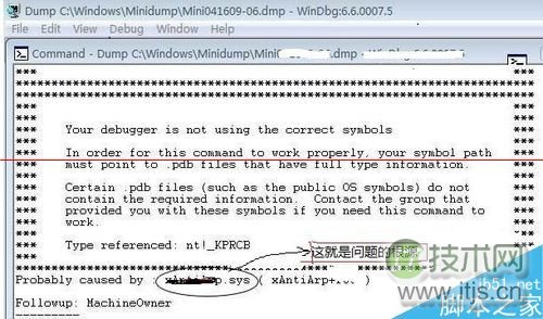 3、下载下载安装后,启动 Debugging Tools,在程序主菜单中选择“File(文件)”-“Open Crash Dump(打开内存转储文件)”,选择路径,打开.DMP文件即可。 打开之后,你会看到一堆英文,假如你英文不好,可以不用理会,只要注意最后一行中出现“Probably caused by:”字样后面的信息即可,这就是罪魁祸首。请看示例: