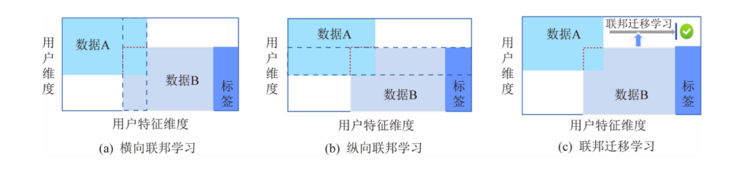 2个数据集的用户特征重叠部分较大,而用户重叠部分较小,如图2.2中(a)所示;2个数据集的用户重叠部分较大,而用户特征重叠部分较小,如图2.2中(b)所示;2个数据集的用户与用户特征重叠部分都比较小,如图2.2中(c)所示。为了应对以上3种数据分布情况,我们把联邦学习分为横向联邦学习、纵向联邦学习与联邦迁移学习。