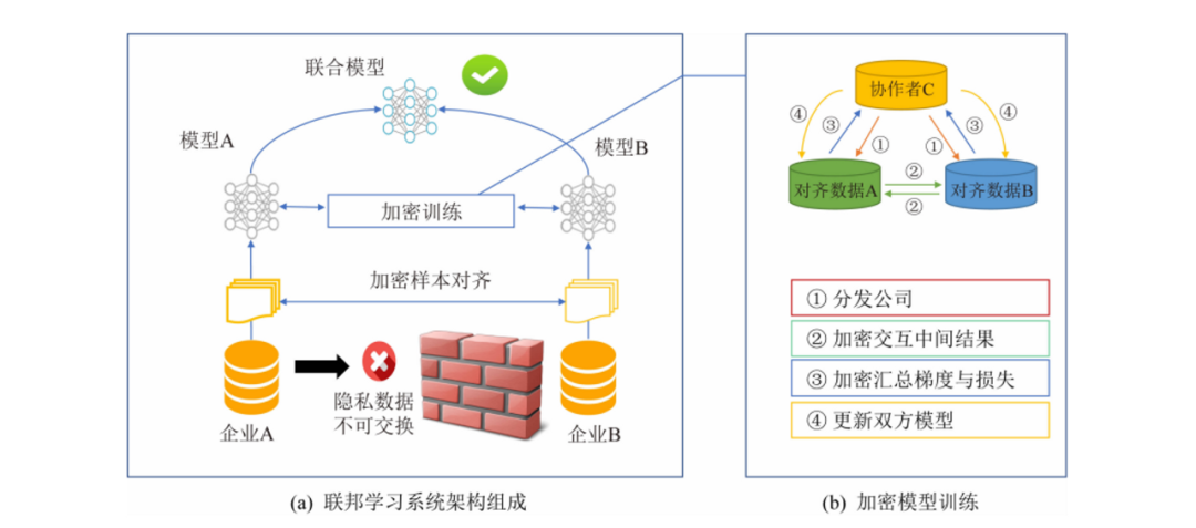 (2)加密模型训练:在确定共有用户群体后,就可以利用这些数据训练机器学习模型。为了保证训 练过程中数据的保密性,需要借助第三方协作者C进行加密训练。以线性回归模型为例,训练过程可分为以下4步(如图(b)所示):