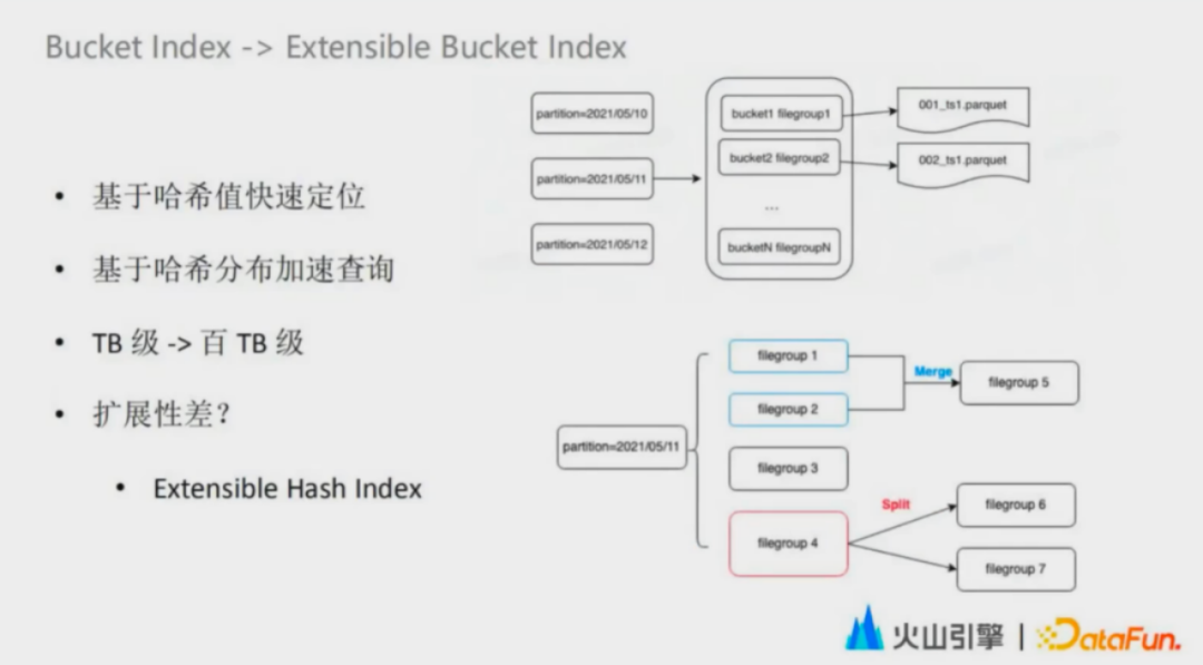 Bloom Filter索引的问题,根因是读取历史数据进行定位,导致定位的时间越来越长。对此,字节采用可扩展数据结构hash,无需读历史数据,也可以快速定位到数据所在位置。