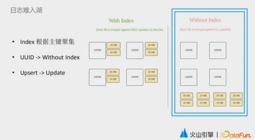 4.提供无索引的机制日志难入湖的本质原因在于Hudi的索引系统,这个索引系统要求数据按照组件聚集,会带来性能上的问题以及资源上的浪费。