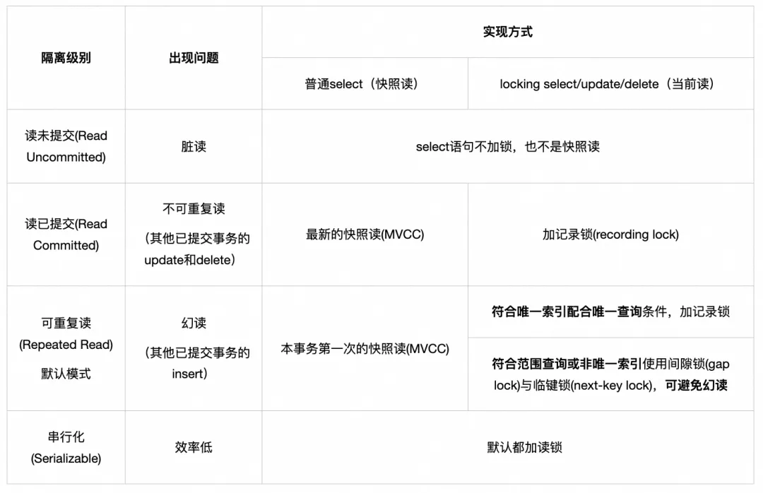 这是MySQL的默认隔离级别。事务在执行过程中,读取的数据是事务开始时的快照,能够保证多次读取返回相同的结果。在这种隔离级别下,MySQL使用多版本并发控制(MVCC)来存储数据的快照,并通过行级锁来防止并发修改。当事务修改某一行数据时,会对该行加排他锁(X锁),其他事务在读取或修改该行时都会被阻塞。此外,为了防止幻读现象(即在一个事务中读取到另一个事务新插入的数据),MySQL的可重复读隔离级别还会使用Next-Key Locks(临键锁),它结合了记录锁(Record Locks)和间隙锁(Gap Locks)。(4) 串行化(Serializable)