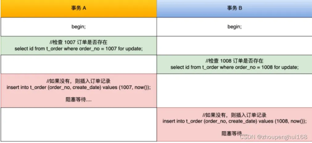 复制-- 开启事务A START TRANSACTION; -- 事务A尝试更新订单1中的产品库存 UPDATE orders SET status = shipped WHERE order_id = 1 AND product_id = 101; -- 事务A接着尝试更新订单2中的相同产品库存(此时订单2可能尚未被锁定) UPDATE orders SET status = shipped WHERE order_id = 2 AND product_id = 101;1.2.3.4.5.6.7.8. 复制-- 开启事务B START TRANSACTION; -- 事务B尝试更新订单2中的产品库存(与事务A中的第二个UPDATE操作相同) UPDATE orders SET status = shipped WHERE order_id = 2 AND product_id = 101; -- 事务B接着尝试更新订单1中的相同产品库存(此时订单1可能已被事务A锁定) UPDATE orders SET status = shipped WHERE order_id = 1 AND product_id = 101;1.2.3.4.5.6.7.8. 示例二:多事务间隙锁+insert导致死锁假设有下面这一张表: