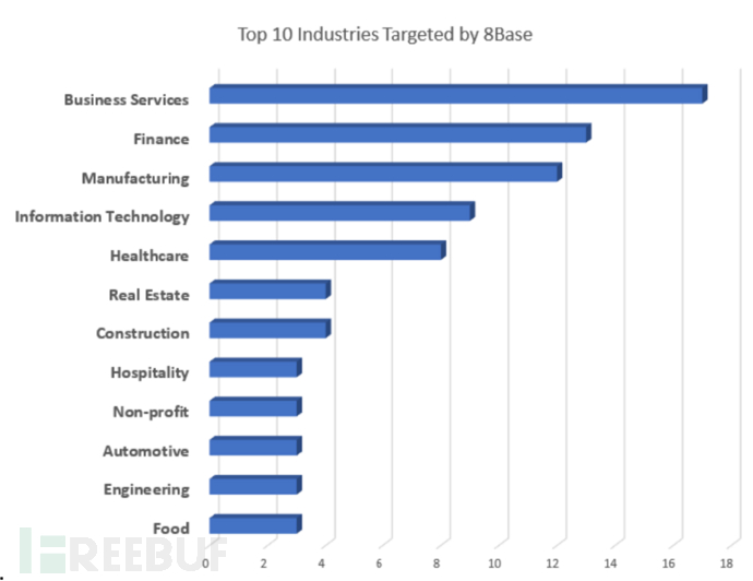 8Base 勒索软件团伙的目标行业有商业服务、金融、软件制造与信息技术。新玩