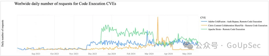 2024年全球RCE漏洞日请求(攻击尝试)数量快速增长 来源:Cloudflare