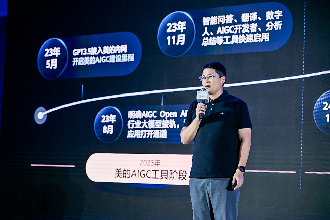 峰会现场,美的集团AI研究院算法部长牟小峰就昇腾超节点在AIGC落地的实践经验进行了主题分享,他表示,美的集团以AI促进企业经营提效、业务模式创新及商业模式升级,已覆盖超过158个核心场景。昇腾超节点为美的开展模型训练提供了坚实支撑,双方联合优化算力利用率,加速美的AIGC战略落地。