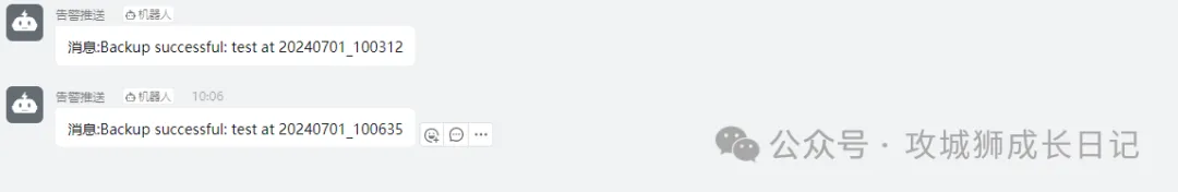 复制 #!/bin/bash # 配置部分 DB_USER="your_db_user" DB_PASSWORD="your_db_password" DB_NAME="my_database" BACKUP_DIR="/path/to/your/backup/directory" DATE=$(date +%Y%m%d_%H%M%S) WEBHOOK_URL="https://oapi.dingtalk.com/robot/send?access_token=${ACCESS_TOKEN}" # 创建备份目录(如果不存在) mkdir -p ${BACKUP_DIR} # 执行备份 mysqldump -u${DB_USER} -p${DB_PASSWORD} ${DB_NAME} > ${BACKUP_DIR}/${DB_NAME}_backup_${DATE}.sql # 检查备份是否成功 if [ $? -eq 0 ]; then echo "Backup successful: ${BACKUP_DIR}/${DB_NAME}_backup_${DATE}.sql" MESSAGE="Backup successful: ${DB_NAME} at ${DATE}" else echo "Backup failed!" MESSAGE="Backup failed for ${DB_NAME} at ${DATE}" fi # 发送钉钉通知 curl -s -o /dev/null -X POST ${WEBHOOK_URL} \ -H "Content-Type: application/json" \ -d "{\"msgtype\": \"text\", \"text\": {\"content\": \"${MESSAGE}\"}}"1.2.3.4.5.6.7.8.9.10.11.12.13.14.15.16.17.18.19.20.21.22.23.24.25.26.27.28.29.30. 解释脚本DB_USER:数据库用户名。DB_PASSWORD:数据库密码。DB_NAME:要备份的数据库名称。BACKUP_DIR:备份文件存储目录。DATE:备份文件名中的时间戳。ACCESS_TOKEN: 钉钉告警的TOKENmysqldump命令用于生成数据库的备份文件,格式为SQL文本文件。mkdir -p命令确保备份目录存在,如果不存在则创建。备份文件命名为${DB_NAME}_backup_${DATE}.sql,包含时间戳以区分不同的备份文件。