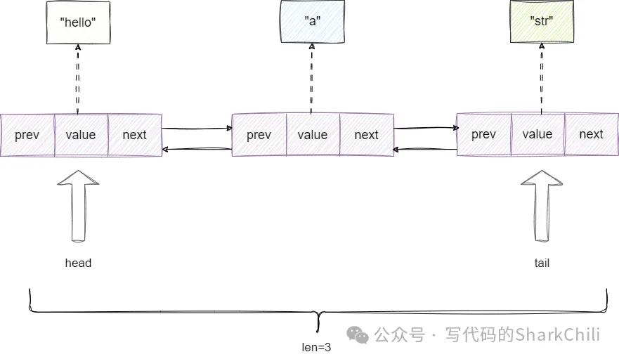 指向链表第一个节点的硬核head指针。指向链表最后一个节点的复刻tail指针。维护链表长度的层双字段len。