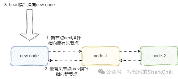 新节点指向原有头节点。原有头节点的前驱指针指向新节点。将head指针指向新节点,完成节点头插。完成这些操作之后,维护一下链表长度信息: