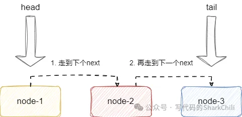 复制func listAddNodeTail(l *list, value *interface{}) *list { //Allocate memory for a new node and set its value. var node *listNode node = new(listNode) node.value = value //If the length is 0, then both the head and tail pointers point to the new node. if l.len == 0 { l.head = node l.tail = node } else { //Append the newly added node after the tail node to become the new tail node. node.prev = l.tail node.next = nil l.tail.next = node l.tail = node } //Maintain the information about the length of the linked list. l.len++ return l }1.2.3.4.5.6.7.8.9.10.11.12.13.14.15.16.17.18.19.20.21. 基于索引定位节点双向链表支持基于索引的方式查询,例如我们希望查询索引2节点的值,传入index为2,双向链表就会基于索引2这个值跳越两次来到目标节点并返回: