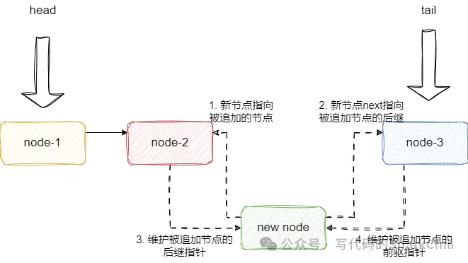 复制func listIndex(l *list, index int64) *listNode { var n *listNode //"If less than 0, calculate the index value as a positive number n, //then continuously jump to the node pointed to by prev based on this positive number n. if index < 0 { index = (-index) - 1 n = l.tail for index > 0 && n != nil { n = n.prev index-- } } else { //Conversely, walk n steps from the front and reach the target node via next, then return. n = l.head for index > 0 && n != nil { n = n.next index-- } } return n }1.2.3.4.5.6.7.8.9.10.11.12.13.14.15.16.17.18.19.20.21.22.23. 指定位置插入双向链表支持在指定元素的前面或者后面插入元素,我们以元素后插入为例,双向链表会将新节点追加到原有节点后面并维护前驱后继指针的信息,插入到指定节点的前方也是同理: