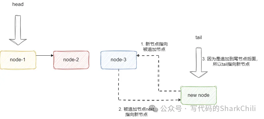 唯一需要注意的就是如果新节点追加到尾节点后面,我们需要将tail指向新节点。追加到头节点同理,我们需要将head指针指向新节点: