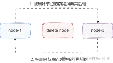 复制func listDelNode(l *list, node *listNode) { //If the predecessor node is not empty, //then the predecessor nodes next points to the successor node of the node being deleted if node.prev != nil { node.prev.next = node.next } else { //If the deleted node is the head node, set the head to point to the next node. l.head = node.next } //If next is not empty, then let next point to the node before the deleted node if node.next != nil { node.next.prev = node.prev } else { //If the deleted node is the tail node, make //the node before the deleted node the new tail node. l.tail = node.prev } //help gc node.prev = nil node.next = nil l.len-- }1.2.3.4.5.6.7.8.9.10.11.12.13.14.15.16.17.18.19.20.21.22.23.24.25.