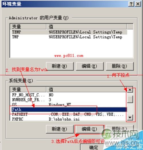 3、在弹出的环境变量窗口中,拉动下拉框,找到并单击选择Path变量名,然后点编辑(N)按扭进行设置。