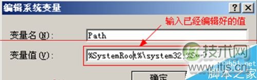 4、弹出编辑系统变量窗口中,将变量值复制出来后,修改为:%SystemRoot%/system32;%SystemRoot%;%SystemRoot%/System32/Wbem即可。