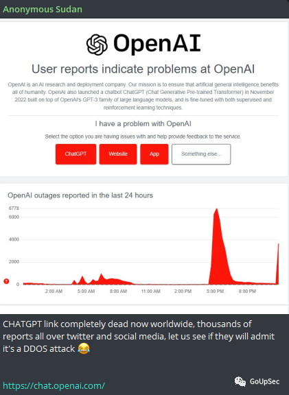 “苏丹匿名者”本周三在Telegram频道上表示:“现在,全球范围的CHatGPT服务都无法使用,推特和社交媒体上有成千上万的(用户)抱怨,让我们看看OpenAI是否会承认这是一次DDoS攻击。源码下载”