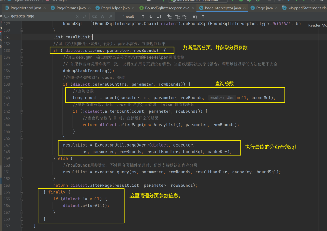 复制//第一种,RowBounds方式的调用 List<Country> list = sqlSession.selectList("x.y.selectIf", null, new RowBounds(0, 10)); //第二种,Mapper接口方式的调用,推荐这种使用方式。 PageHelper.startPage(1, 10); List<Country> list = countryMapper.selectIf(1); //第三种,Mapper接口方式的调用,推荐这种使用方式。 PageHelper.offsetPage(1, 10); List<Country> list = countryMapper.selectIf(1); //第四种,参数方法调用 //存在以下 Mapper 接口方法,你不需要在 xml 处理后两个参数 public interface CountryMapper { List<Country> selectByPageNumSize( @Param("user") User user, @Param("pageNum") int pageNum, @Param("pageSize") int pageSize); } //配置supportMethodsArguments=true //在代码中直接调用: List<Country> list = countryMapper.selectByPageNumSize(user, 1, 10); //第五种,参数对象 //如果 pageNum 和 pageSize 存在于 User 对象中,只要参数有值,也会被分页 //有如下 User 对象 public class User { //其他fields //下面两个参数名和 params 配置的名字一致 private Integer pageNum; private Integer pageSize; } //存在以下 Mapper 接口方法,你不需要在 xml 处理后两个参数 public interface CountryMapper { List<Country> selectByPageNumSize(User user); } //当 user 中的 pageNum!= null && pageSize!= null 时,会自动分页 List<Country> list = countryMapper.selectByPageNumSize(user); //第六种,ISelect 接口方式 //jdk6,7用法,创建接口 Page<Country> page = PageHelper.startPage(1, 10).doSelectPage(new ISelect() { @Override public void doSelect() { countryMapper.selectGroupBy(); } }); //jdk8 lambda用法 Page<Country> page = PageHelper.startPage(1, 10).doSelectPage(()-> countryMapper.selectGroupBy()); //也可以直接返回PageInfo,注意doSelectPageInfo方法和doSelectPage pageInfo = PageHelper.startPage(1, 10).doSelectPageInfo(new ISelect() { @Override public void doSelect() { countryMapper.selectGroupBy(); } }); //对应的lambda用法 pageInfo = PageHelper.startPage(1, 10).doSelectPageInfo(() -> countryMapper.selectGroupBy()); //count查询,返回一个查询语句的count数 long total = PageHelper.count(new ISelect() { @Override public void doSelect() { countryMapper.selectLike(country); } }); //lambda total = PageHelper.count(()->countryMapper.selectLike(country));1.2.3.4.5.6.7.8.9.10.11.12.13.14.15.16.17.18.19.20.21.22.23.24.25.26.27.28.29.30.31.32.33.34.35.36.37.38.39.40.41.42.43.44.45.46.47.48.49.50.51.52.53.54.55.56.57.58.59.60.61.62.63.64.65.66.67.68.69.其核心原理是将传入的页码和条数赋值给一个Page对象,并保存到本地线程ThreadLocal中。