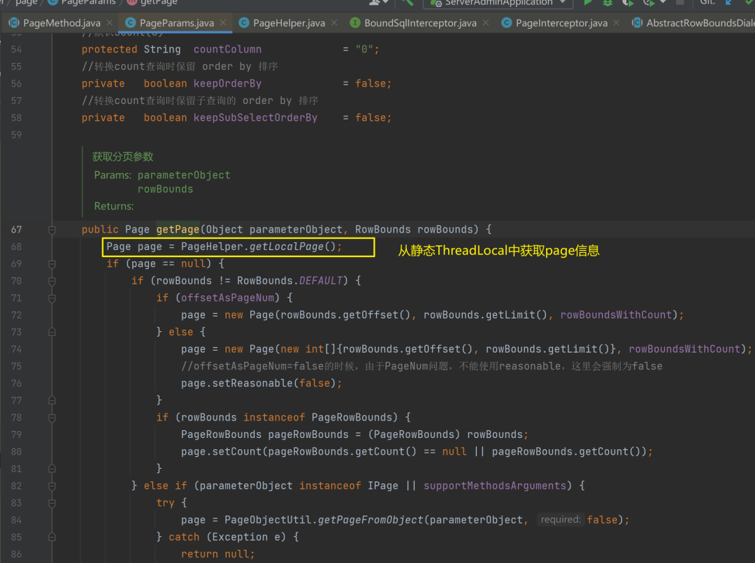 复制public static <E> Page<E> startPage(int pageNum, int pageSize, boolean count, Boolean reasonable, Boolean pageSizeZero) { Page<E> page = new Page<E>(pageNum, pageSize, count); page.setReasonable(reasonable); page.setPageSizeZero(pageSizeZero); //当已经执行过orderBy的时候 Page<E> oldPage = getLocalPage(); if (oldPage != null && oldPage.isOrderByOnly()) { page.setOrderBy(oldPage.getOrderBy()); } setLocalPage(page); return page; }1.2.3.4.5.6.7.8.9.10.11.12. 重点在setLocalPage(page) 这个方法,将page对象放到了静态变量ThreadLocal中。