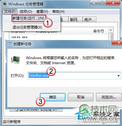 4、使用快捷键 CTRL+SHIFT+ESC 调出任务管理器,在“文件”下选择“新建任务”。键入“SideBar.exe”,然后按“确定”。重新恢复各项小工具的运行。