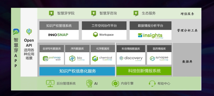 上图是智慧造实智慧芽APP 的产品架构图,包括后台管理系统、芽打AI、时分内容引擎、析新帮助中心,基于为客户提供知识产权信息化服务和科技创新情报系统。智慧造实