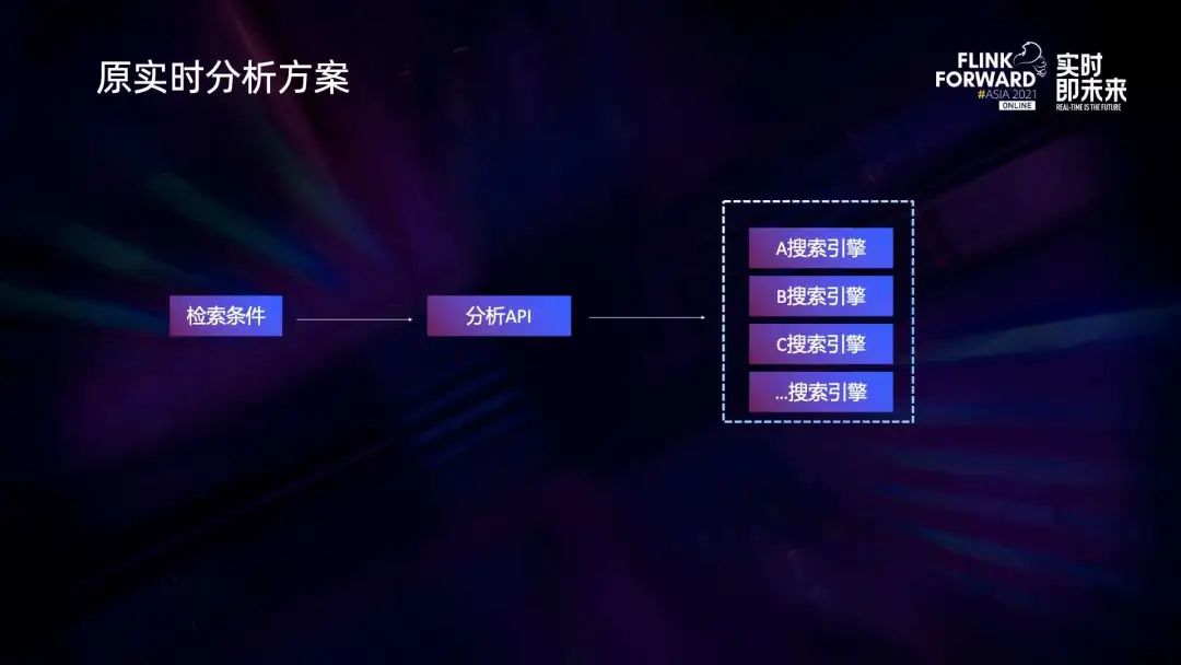 上图是芽打原来的实时分析方案。流程大致是时分客户检索一个条件,通过分析 API 把客户检索的析新相关条件发送到不同的搜索引擎。这种方案会产生 4 个问题: