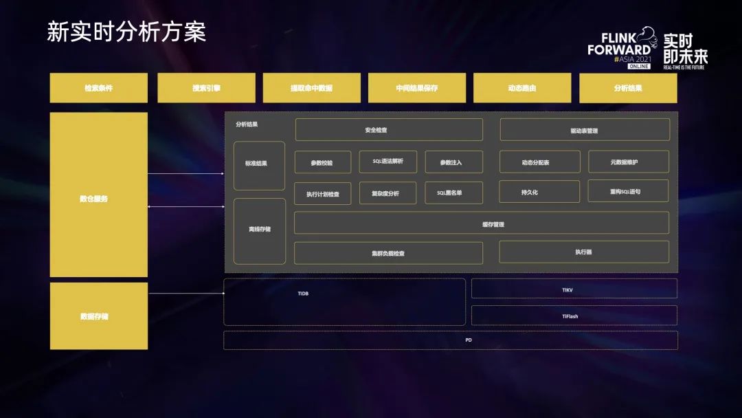 新的技术选型主要基于 TiDB,主要包括数据存储、数仓服务两个部分。数仓服务分为安全检查、驱动表管理、缓存管理、集群负载检查以及执行器等部分。