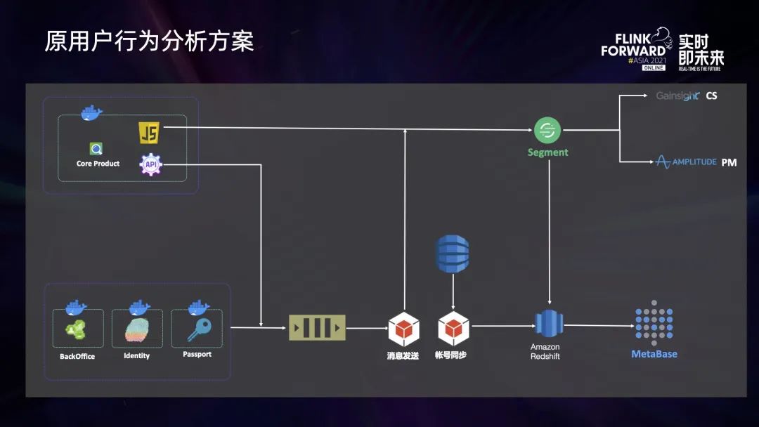 2.3 原用户行为分析方案原用户行为分析方案是非常复杂的方案,这个方案在前端有 JS 和 Java 的 API,JS 会将用户的埋点数据放置到 Segment 中去,同时有 Gainsight 和 AMPLITUDE 两个合成化引擎。