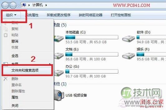二、进入计算机后,我们只需点击最左上角“组织”旁边的下拉箭头,然后选择“文件夹和搜素选项”,如下图所示: