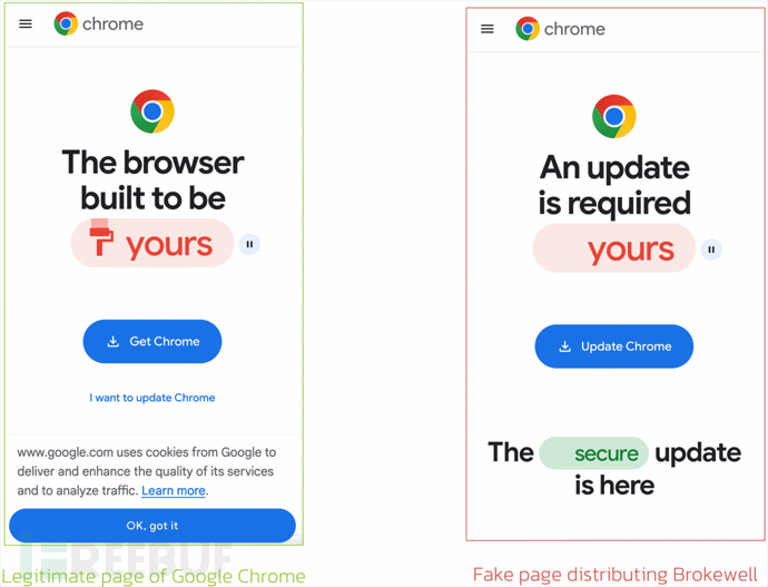 合法(左)和假冒(右)Chrome 浏览器更新页面