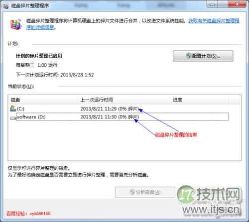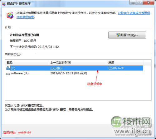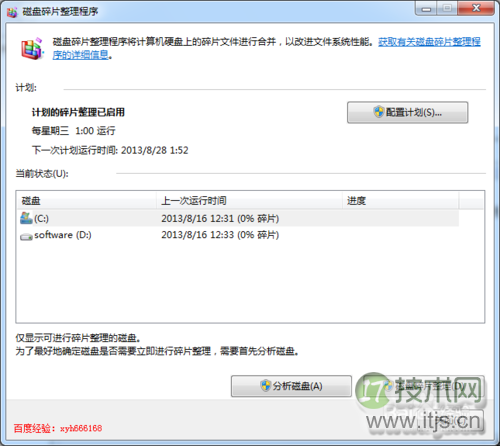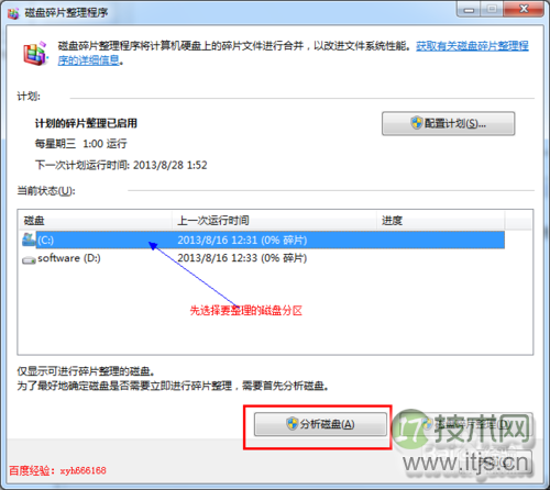 3、整理为了最好的确定磁盘是否需要进行磁盘碎片整理,一般要对磁盘当前的状况进行分析,分析后,我们再决定是否要对磁盘进行碎片整理,若是碎片不多,那么无需进行磁盘整理,云南idc服务商先选择要分析的磁盘,然后点击下面的“分析磁盘”按钮
