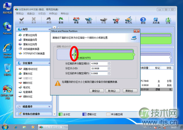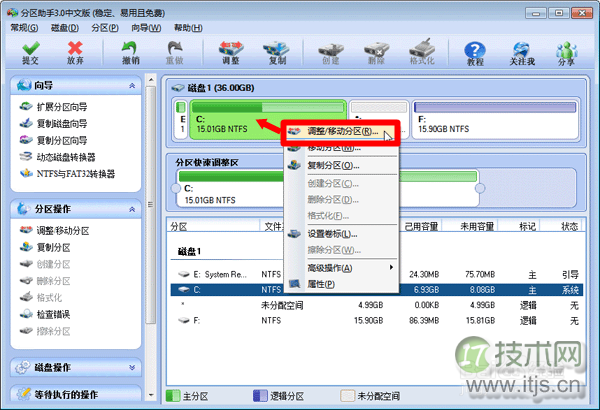 2、助手第一步,统运先缩小(即压缩)F盘到15.90GB(腾出5G空间),区助在F盘上右击在弹出的手图菜单中选择 调整/移动分区 选项,然后就会弹出设置窗口,系统s系行分向右拖动左边的手柄以缩小F盘15.90GB。