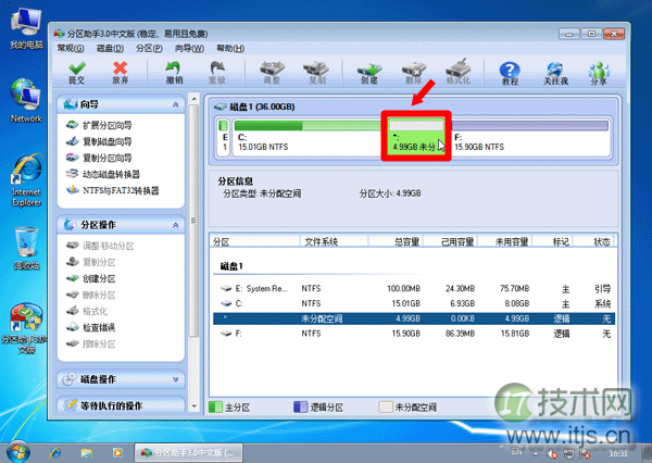 3、点击确定之后,再返回到主界面,企商汇即可看到这块大小为 4.99GB 的未分配空间。