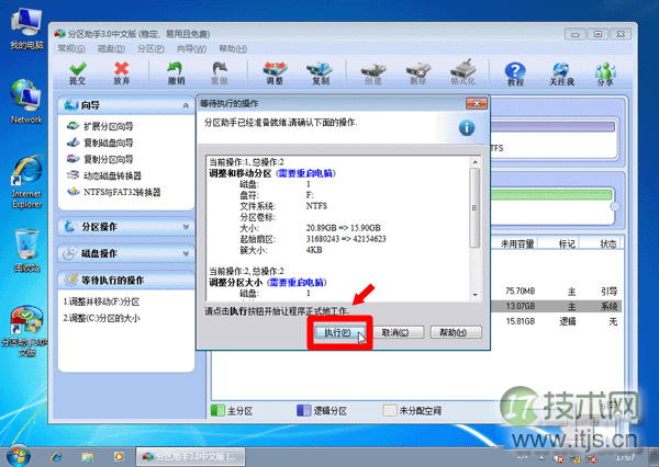 7、以上的操作还没对磁盘进行设置,工具栏上有一个 提交 按钮,击它之后就会有设置框弹出,再点击 执行 按钮,来完成这两个操作动作到真实的磁盘上(点击之前检查一下)。