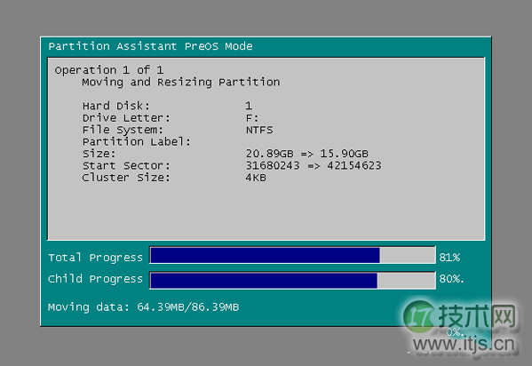 8、在点击执行后,分区助手会提示重启电脑在重启模式(PreOS Mode)下执行这些操作,这时点击 是 ,电脑会自动重启,执行这些操作(英文界面),此时需要注意:尽量不要擅自中断电源,否则会导致严重的出错。