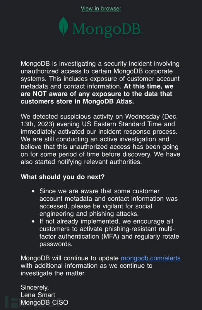 发送给 MongoDB 客户的击大据信通知(来源:VX-underground)
