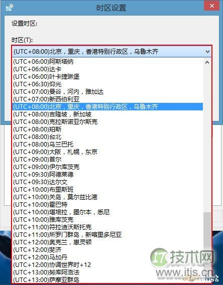 4、在时区设置中,我们点击下三角标识,在弹出的各地时区中,选择我们所处的地方即可,如下图所示: