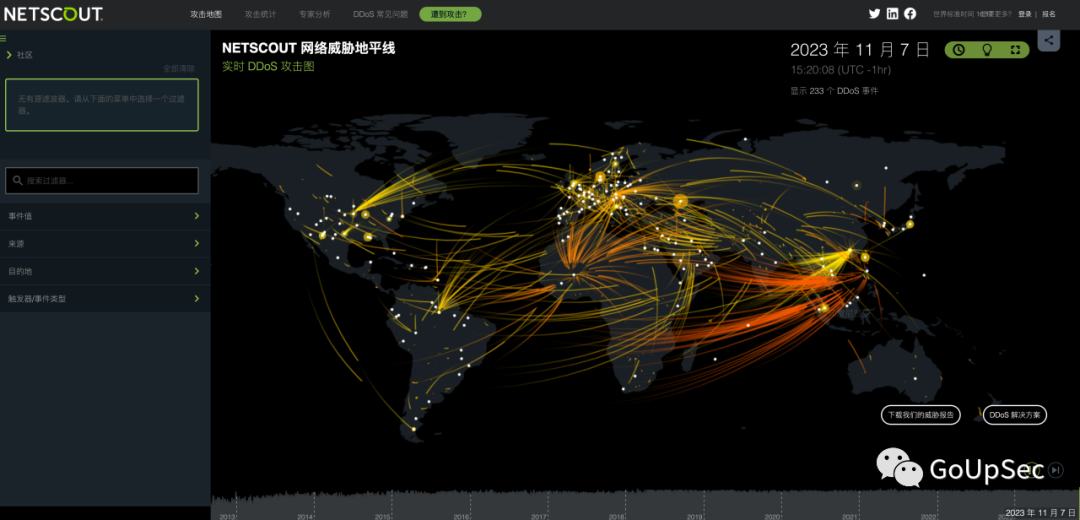Fortinet Threat MapFortinet威胁地图提供了恶意软件、僵尸网络和DDoS攻击等全球范围内网络攻击的实时可视化数据。Fortinet利用其广泛的全球威胁情报网络收集此地图的数据,包括来自全球FortiGate设备的信息。