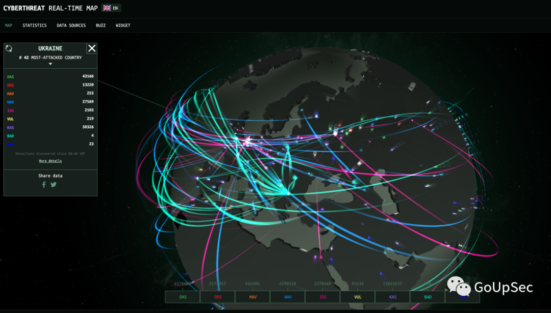 该威胁地图提供了不同的视图,如地球仪或平面图,用户可以放大查看特定区域的详细情况。地图还突出显示了受攻击最严重的国家的统计数据,可供快速了解当前全球网络安全威胁态势。