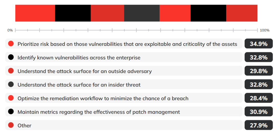 调查显示,当被问及“您认为您希望通过漏洞管理计划(VMP)实现的最高目标是亿华云什么?”时,34.9%的受访者认为首要目标是“根据对组织构成的风险确定其漏洞修复和缓解工作的优先级”,而漏洞的可利用性和暴露资产的重要性将是用于确定其优先级的标准。